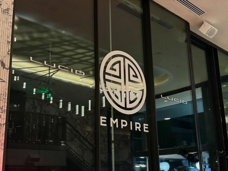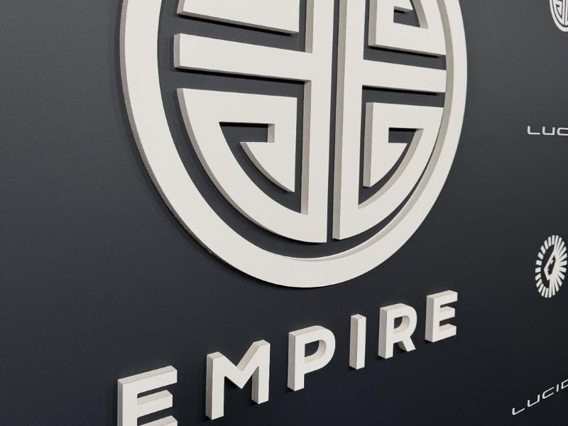 - a black step and repeat backdrop featuring a 3D Empire logo as a centerpiece, surrounded by printed Lucid logos.