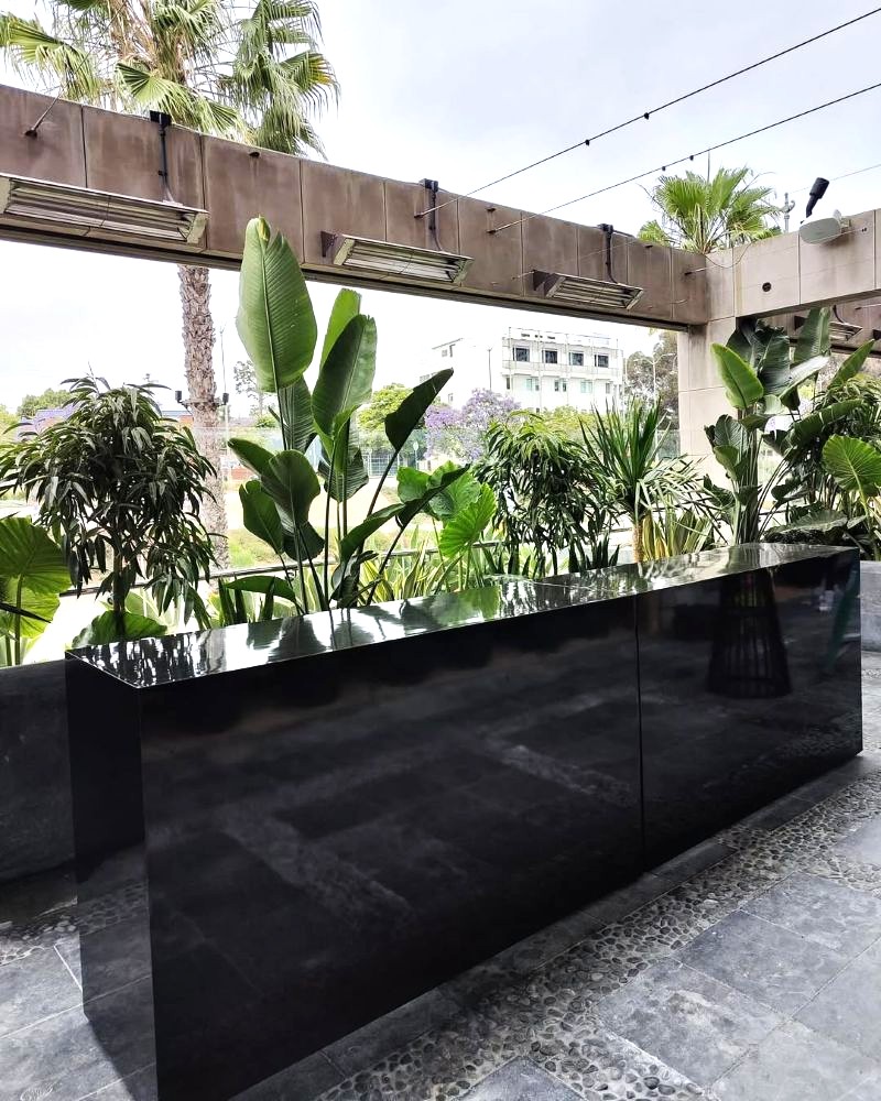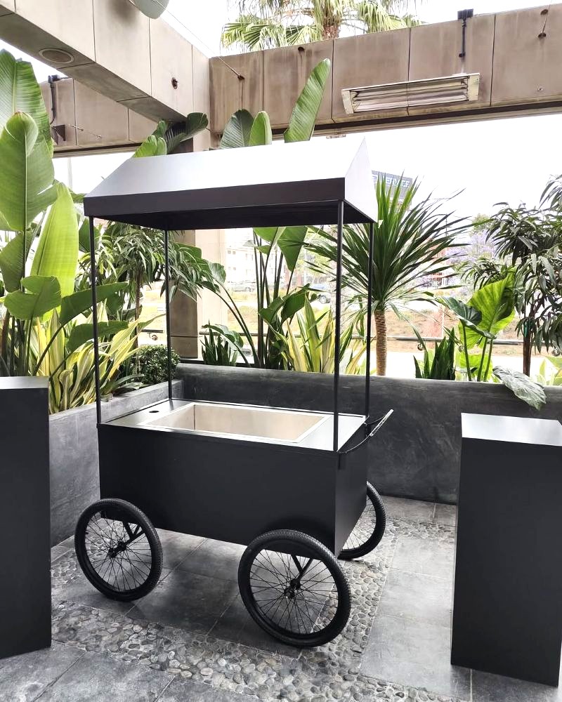 - two 6-ft black bars and a signature coffee cart placed on the atrium area.