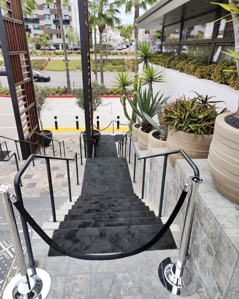 - a long black carpet leading guests from the sidewalk up stairs to the entrance of the venue where the step and repeat was set up for photo op.