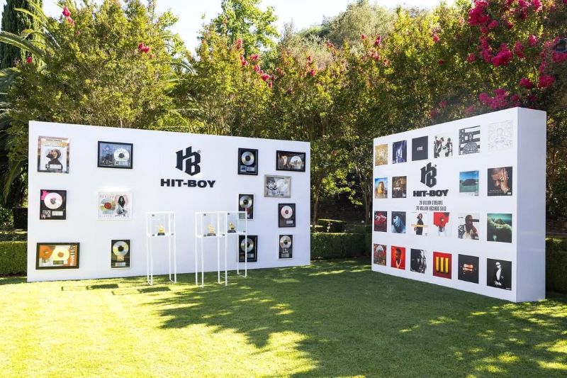 - 1 white display wall featuring HitBoy’s framed platinum records.